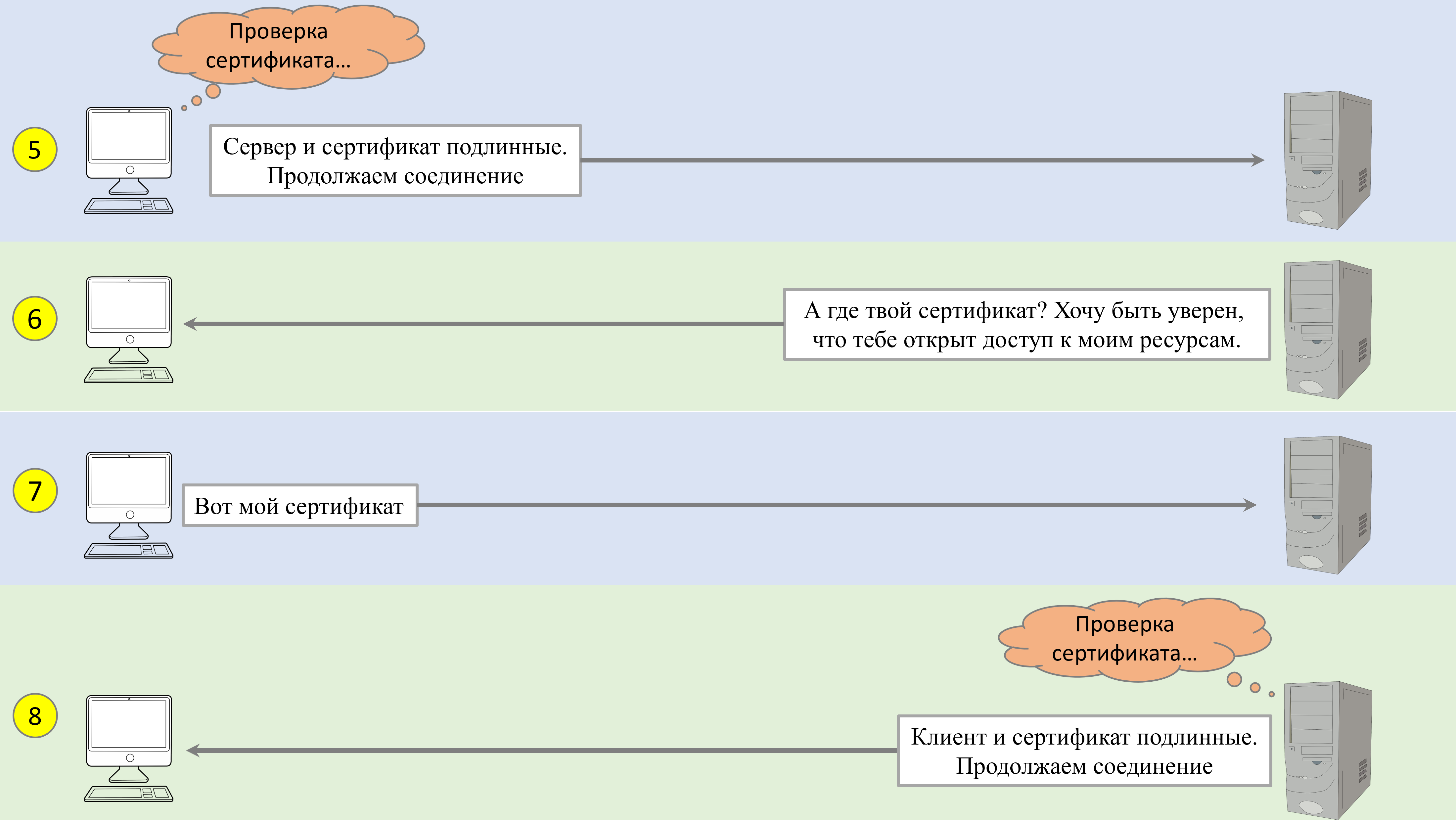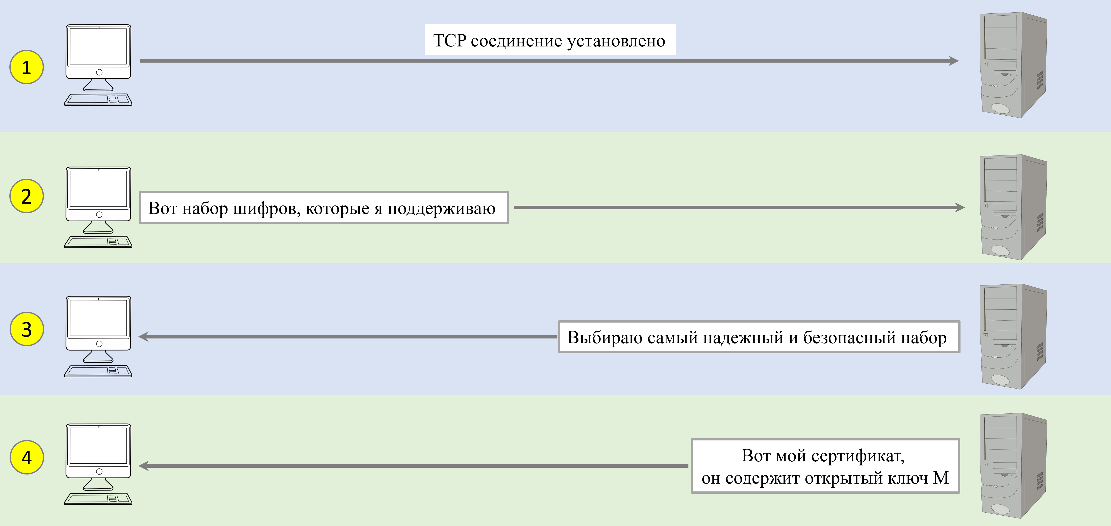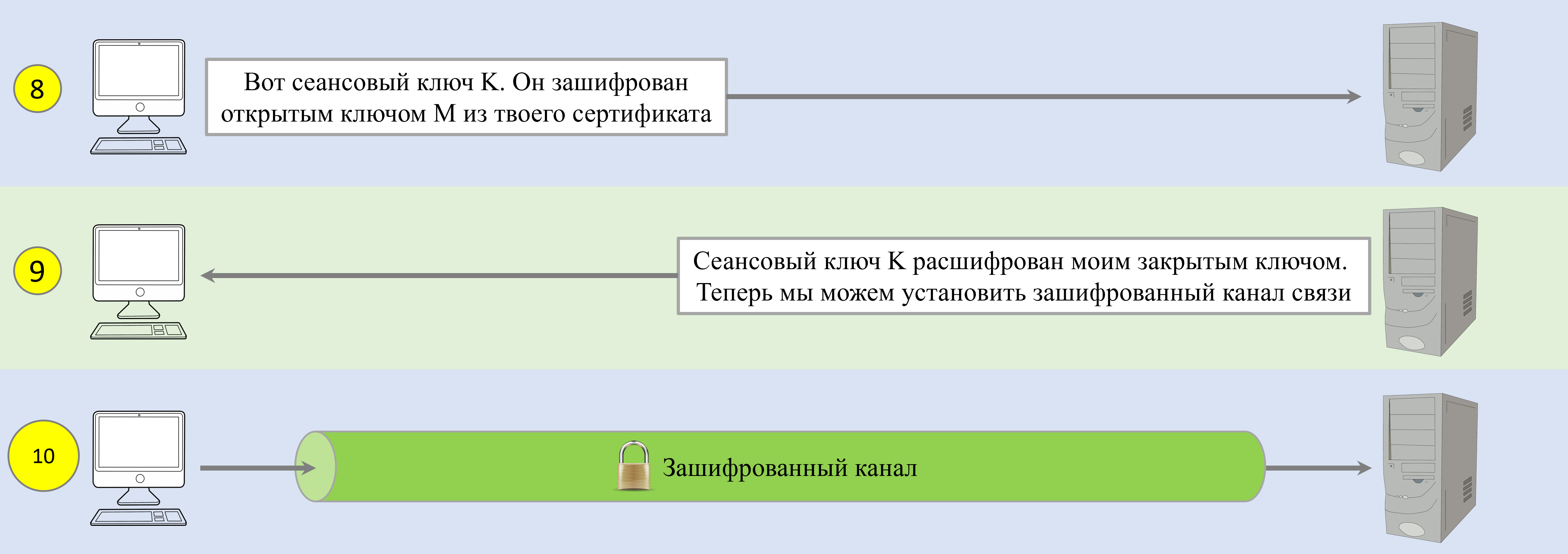 А теперь давай рассмотрим как это происходит в реальности. У нас будет 2 действующих лица - клиент и сервер. В качестве клиента будет твой любимый браузер, а в качестве сервера - твой PornHUB. Всё, как и в жизни, начинается с рукопожатия, а точнее даже с двух - сначала TCP , а потом TLS - он то нам и интересен: Итак, браузер отправляет на сайт сообщение Client Hello, которое означает примерно: “Здаров, я тут безопасное соединение хочу установить, а то мало ли что. Вот версии TLS и список алгоритмов шифрования, в которые я могу, чё скажешь?” Сайт отправляет тебе Server Hello, в котором говорит: “Окэ, мне нравится вот эта версия TLS и этот алгоритм - будем работать по ним. А и ещё - лови мой сертификат и публичный ключ, а еще чекни, что я реально тот, за кого себя выдаю.” Твой браузер внимательно проверит сертификат и если всё ок, то отправит сообщение Client Key Exchange: “Серт в норме. Но мне нужно проверить твой закрытый ключ. Я щас сгенерирую общий секретный ключ (это называется pre-master key) и зашифрую твоим открытым ключом. Посмотрим, сможешь ли ты расшифровать его!” “Да ваще изи, ща как возьму свой закрытый ключ и готово. Теперь, с помощью pre-master ключа, я намучу нам главный секрет (или сеансовый ключ) (shared secret), которым будем шифровать всё наше общение - лови!” “Круто!”, ответит твой браузер - “Я зашифровал тестовое сообщение сеансовым ключом, расшифруй его и пришли мне обратно” полетит это всё в сообщении Change Cipher spec “Изи, но постыдился бы ты такое писать… лан, всё работает, погнали шифровать все наши сообщения” - и отправит тебе Finished Понимаешь, что произошло? Сеансовый ключ - это симметричное шифрование, а обменялись они им при помощи алгоритмов ассиметричного! И всё это происходит так за миллисекунды, ты даже этого не замечаешь.